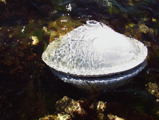 A 300m expanse of twenty six bivalve forms: reclaimed hand basins, their entire surface enamelled, placed in the D'Entrecasteaux Channel's tidal flats south of Hobart. The channel is a breeding ground for saltwater scallops.